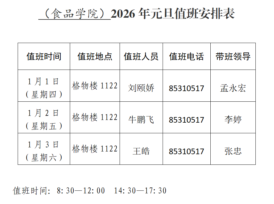食品学院2026年元旦值班安排表